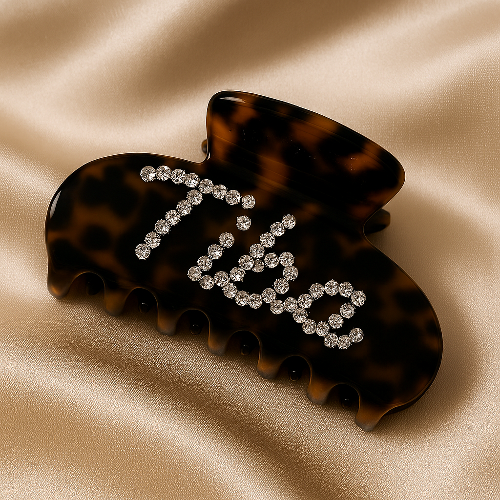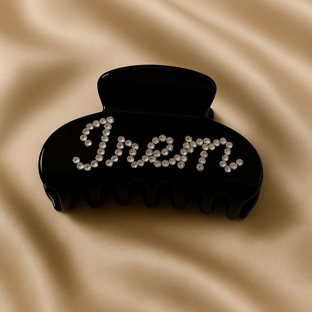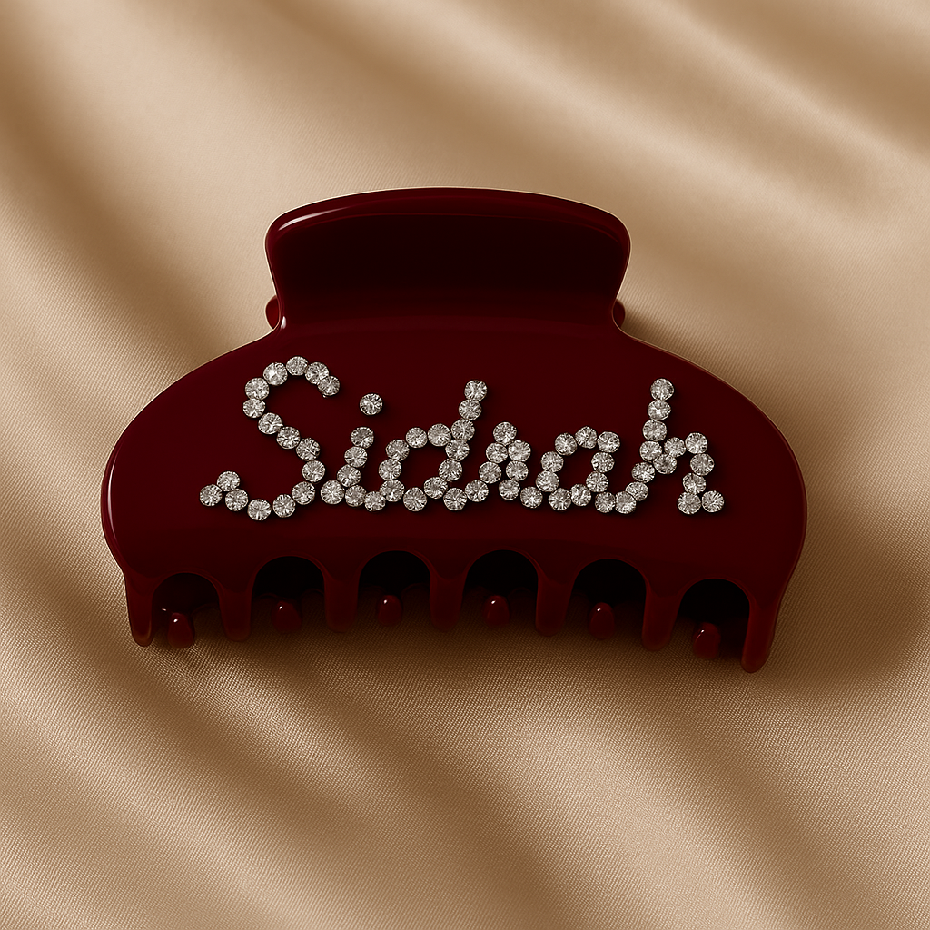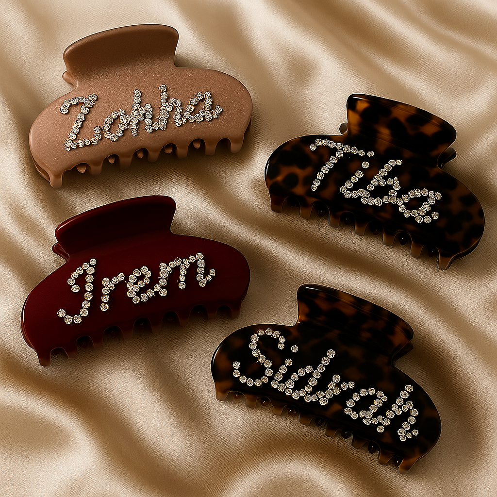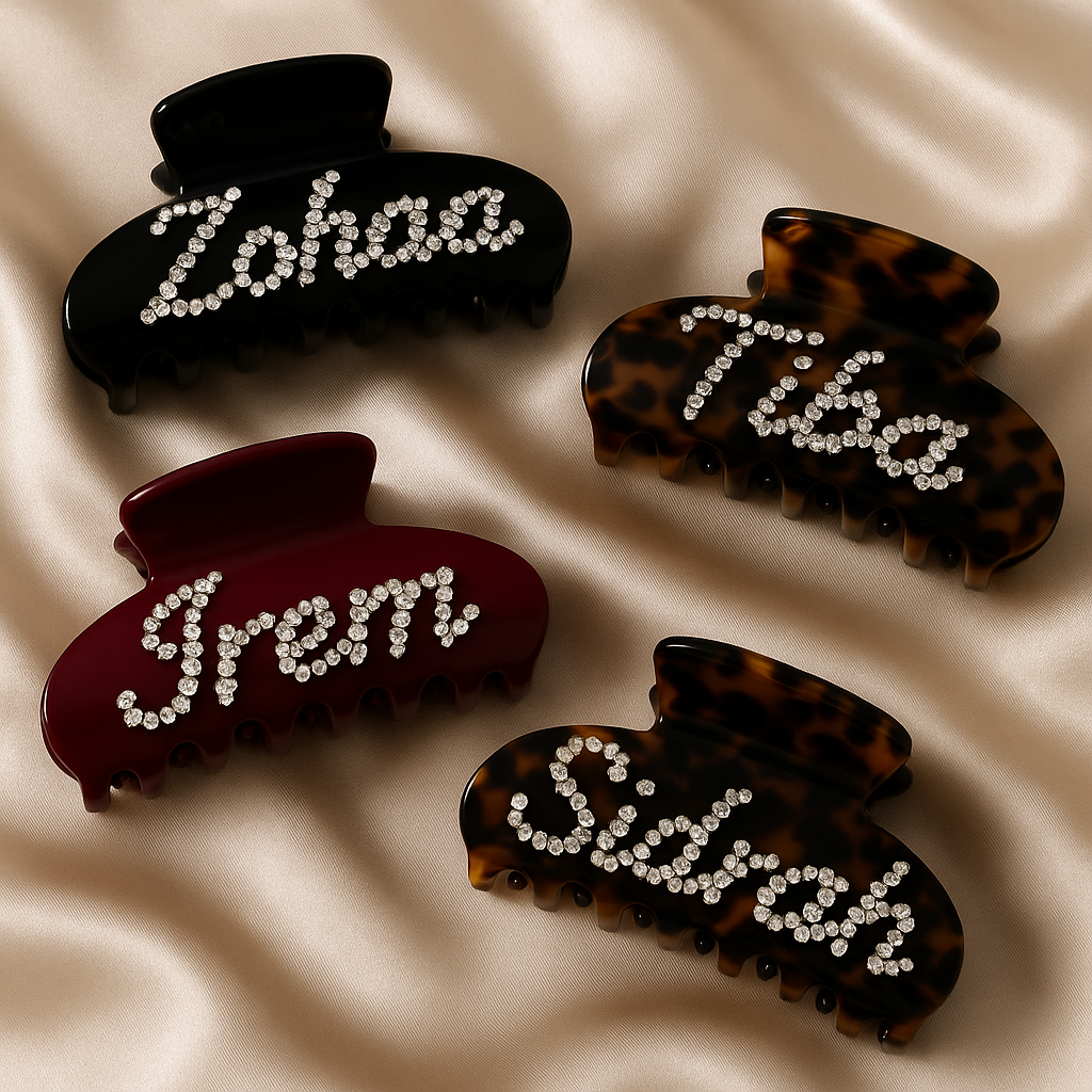 Add a touch of glam with our custom name claw clips — designed with sparkling rhinestones and luxe finishes like tortoiseshell, black, burgundy, and brown.